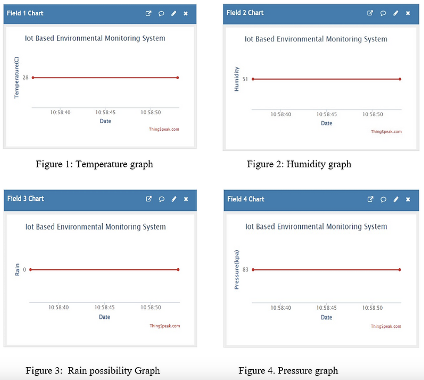 Temperature, humidity, and pressure were obtained from the ThingSpeak as 28 °C, 51%, and 83 kPa, respectively. However, the temperature measured by the thermometer was 27 °C, while the pressure and humidity measured online were 52% and 99 kPa, respectively.